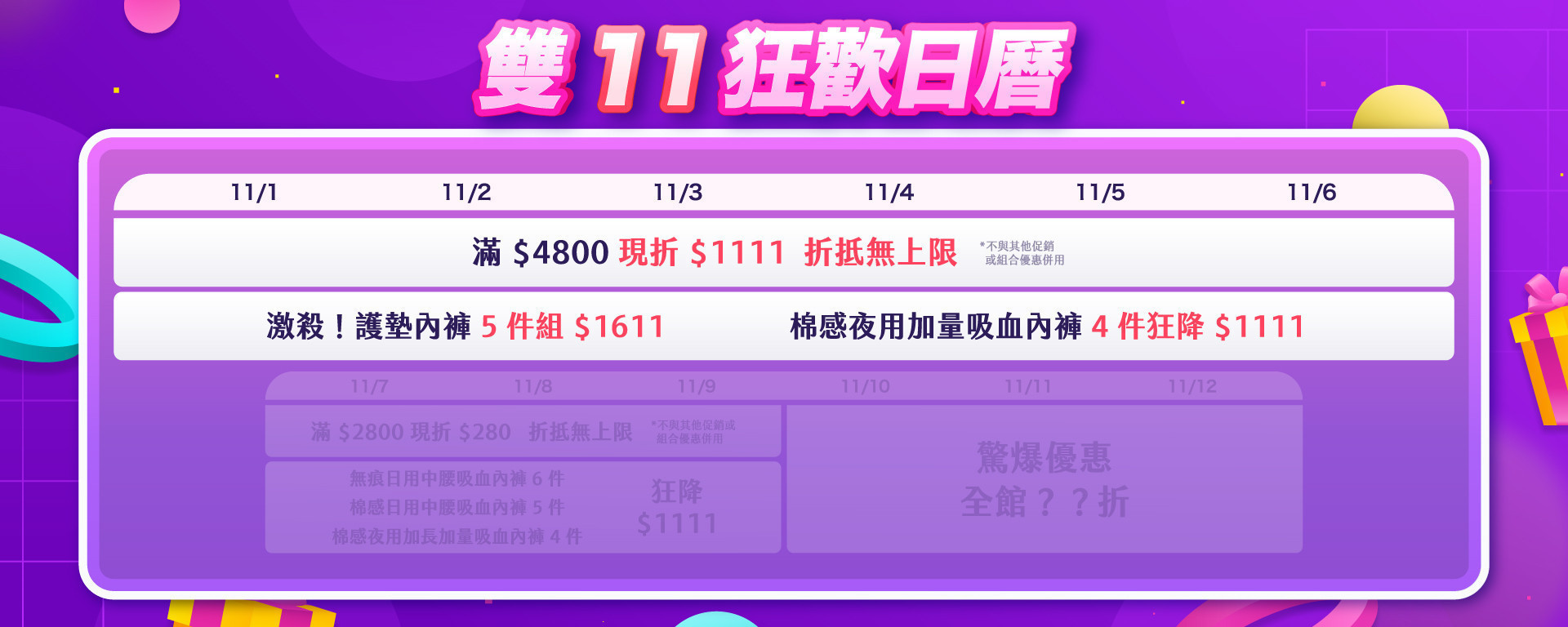 雙 11 激殺 68 折|護墊內褲 5 件組 $1611