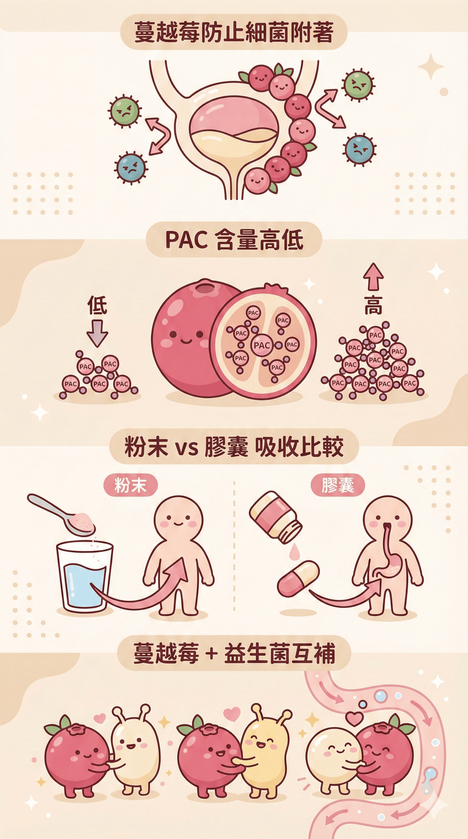但重點是:蔓越莓裡真正被認為有效的成分是 PAC(原花青素),PAC 的效果和劑型、每日攝取量(例如一些綜合分析指出每日達到一定 mg 的 PAC 以上,才有較明顯的預防效果)有關。也就是說,單純「粉末」或「膠囊」並不是最關鍵,關鍵是 劑型裡的活性成分如何標示與劑量。