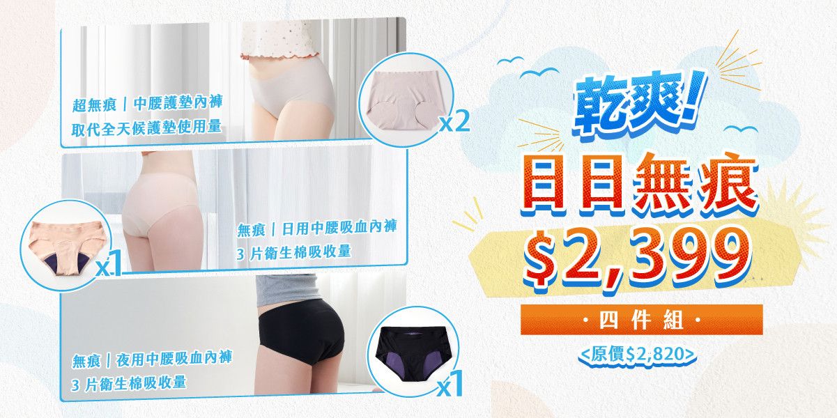 日日乾爽無痕 4 件組|護墊內褲奶茶米兩件+日用蜜桃膚+夜用靜謐黑