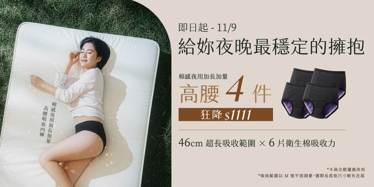 夜夜安心組|棉感加長加量吸血內褲 4 件狂降 $1111