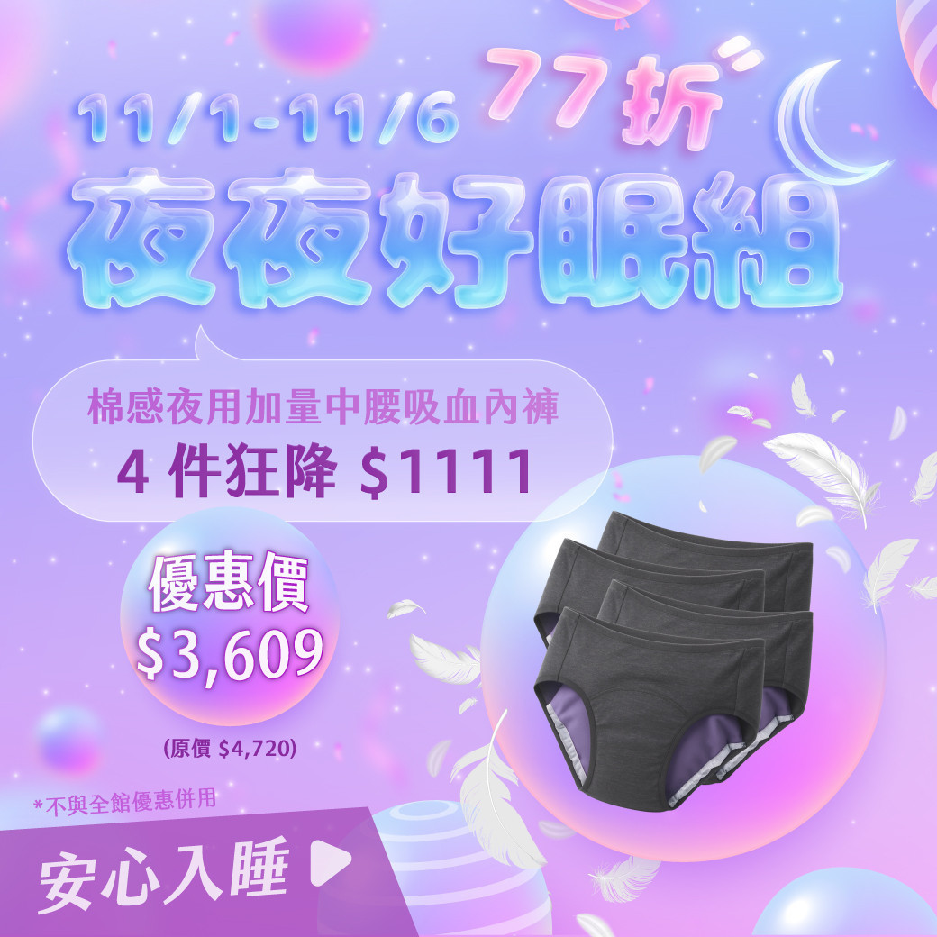 夜夜好眠組|棉感加量吸血內褲 4 件狂降 $1111